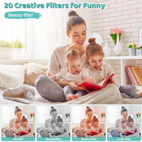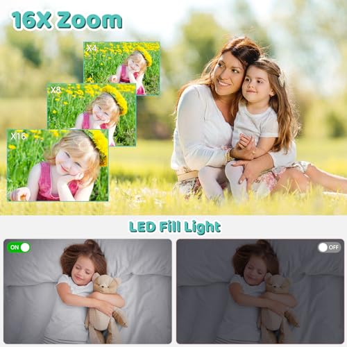 【16X digital zoom and webcam】 This portable kids camera features 16x optional zoom function, You can press the W/T button to zoom in or zoom out the subject, pause function allows you to pause when record or playback videos. The point and shoot digital camera also can be used as a webcam, suitable for video calls, vlogging, online teaching, live streaming and etc, when kids want to share life on social media, you can switch to webcam mode live.