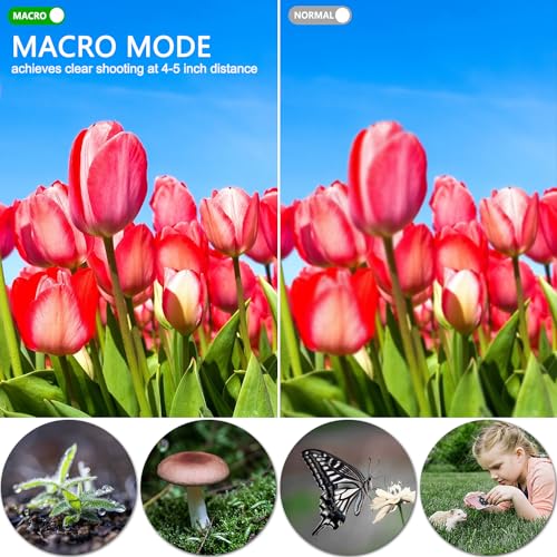 【Macro mode & Auto focus 】The autofocus function ensures your subjects are sharp and in focus, whether you’re capturing fast-moving action or delicate close-ups. Macro mode achieves clear shooting of flowers, plants, insects, and samll objets at 4-5 inch distance, suitable for beginners and children. Note: macro switch is beside the lense, UP is macro mode for 4-5inch close-ups, DOWN is nornal shooting mode for far scene.