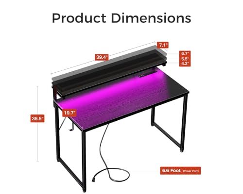 Small Desk, 40 Inch Gaming Desk with LED Lights and Power Outlet, Computer Desk with Adjustable Monitor Shelf (3 Heights), Home Office Table Study Desk Compact Desk for Small Space, Black