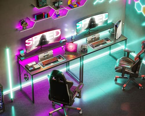 GAMING DESK WITH LED LIGHTS: This gaming desk is equipped with a RGB LED strip lights under its monitor shelf which offers 10 static colors and 10 dynamic modes. You can freely switch between different lighting colors by pressing the button, according to your mood or the specific usage scenario. Whether you are gaming, live streaming, or daily working, it adds a vibrant atmosphere to your room, enhancing your overall experience.