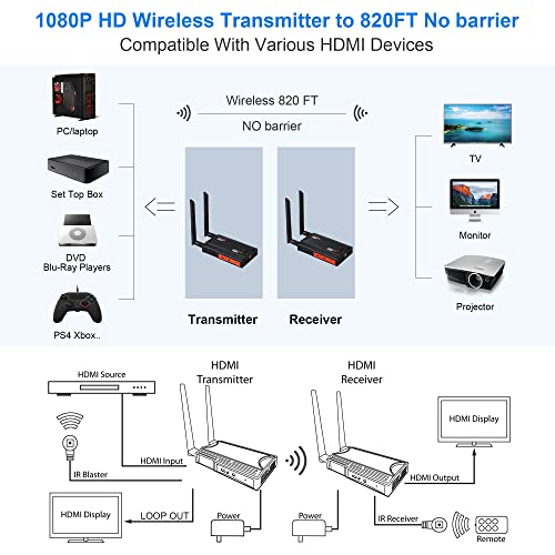 Wireless HDMI Transmitter and Receiver,1080P Full HD Wireless HDMI Extender Kit 820FT with HDMI Loop-Out and Support IR Remote Streaming from PC,Camera,Laptop,Netflix,Ps4/5 to HDTV/Projector/DSLR
