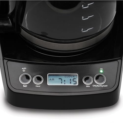 Get your morning Caffeine fix with the caress mini drip Coffee maker. With a black base and stainless steel accents, It comes with a glass carafe with brew-through lid, and a permanent gold tone filter. The drip-free pouring spout and ergonomic handle makes it comfortable to hold and easy to pour without messy spills. It also features an internal water level indicator as well as programmable 24-hour timer and clock with digital LCD display. A coated non-stick warming plate keeps your Coffee hot for two hours and the machine automatically shuts off after two hours. Backed by a manufacturer’s one year limited, This drip Coffee maker is sure to guarantee satisfaction.