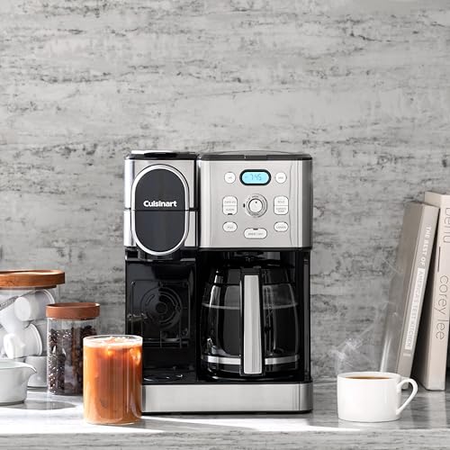 Drip or pod, hot or iced, single cup or carafe for 12—get your coffee, your way with the Cuisinart 2-in-1 Coffeemaker. This kitchen essential for coffee lovers takes home brewing to another level by combining 12-cup carafe and single-serve options in one convenient unit. Brew a full pot 25% faster with Extreme Brew technology. Customize when and how you want your coffee with advanced start, Brew Pause™, temperature control, auto-off, and bold flavor settings. Instantly brew a single serving of hot coffee in 5 cup sizes with any pod, including Keurig K-Cup®, or the reusable HomeBarista™ filter. Or brew over ice for delicious coffee that refreshes! Experience complete brewing versatility and customizable convenience, courtesy of Cuisinart!