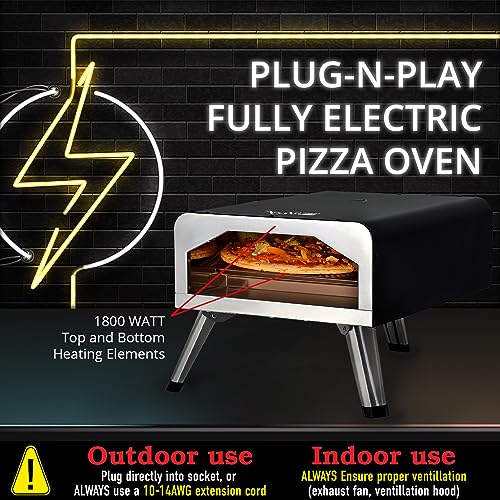 TOOLS OF THE TRADE – This pizza oven comes complete with a range of essential accessories. Included in the package are a Pizza Cutter, Pizza Peel, 2-in-1 Pizza Stone, Brush, Pie Server, and Recipe Book. IMPORTANT: For optimal performance and safety, only use extension cords rated 10 – 14 AWG if one is necessary. Avoid using insufficient light-duty extension cords as they may compromise the oven’s performance and pose a fire hazard.