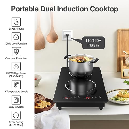 Double Induction Cooktop, 110V Electric Cooktop 2300W Electric Stove Top with 2 Burner Independent Control, Ultrathin Body, 9 Temperature, Multiple Power Levels, 2 Hour Timer, Safety Lock
