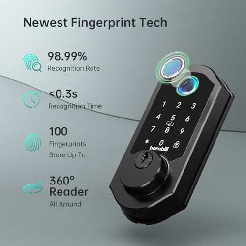 Hornbill Front Door Lock Set: WiFi Keyless Entry Smart Deadbolt Knob with Fingerprint Keypad App Code Fobs Remote Control Alexa Google, Digital Electronic Touchscreen Lock for Exterior – Matt Black