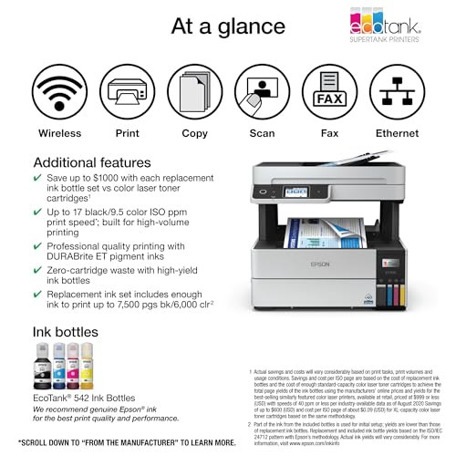 2 Years of Unlimited Ink promo valid for ET-5150, ET-5170, ET-5180, ET-5800, ET-5850, ET-5880, ET-16600 or ET-16650 printers purchased from 10/1/2021 to 3/31/2024. Product must be registered within 30 days of purchase. Limit four 542 ink bottles per claim. Each claim cannot contain multiple bottles of the same color. Retain your empty 542 ink bottle for submission along with rebate form. Promotion applies to ink only. Printer covered by Epson 2-year ltd wnty with registration. For promo participation, you must register your product. See manufacturer’s website for details.