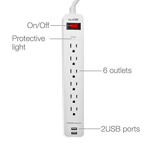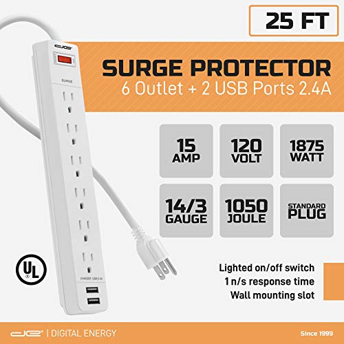 Digital Energy 6-Outlet + 2 USB 1050 Joule Surge Protector Power Strip with 25-Ft Long Extension Cord, White, UL Listed