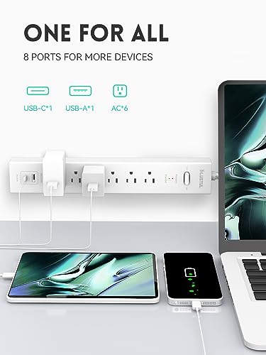 💡【Power strip with USB Ports】 6 AC outlets(125V/15A/1875W), 1 USB-A port(5V/2.4A), and 1 USB-C port(PD20W) to power up to 8 devices simultaneously.